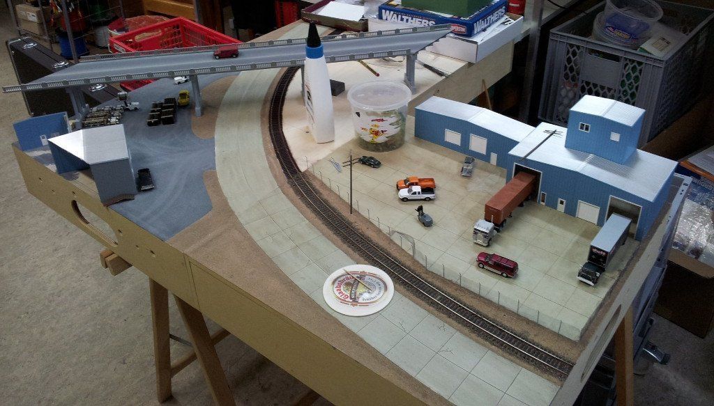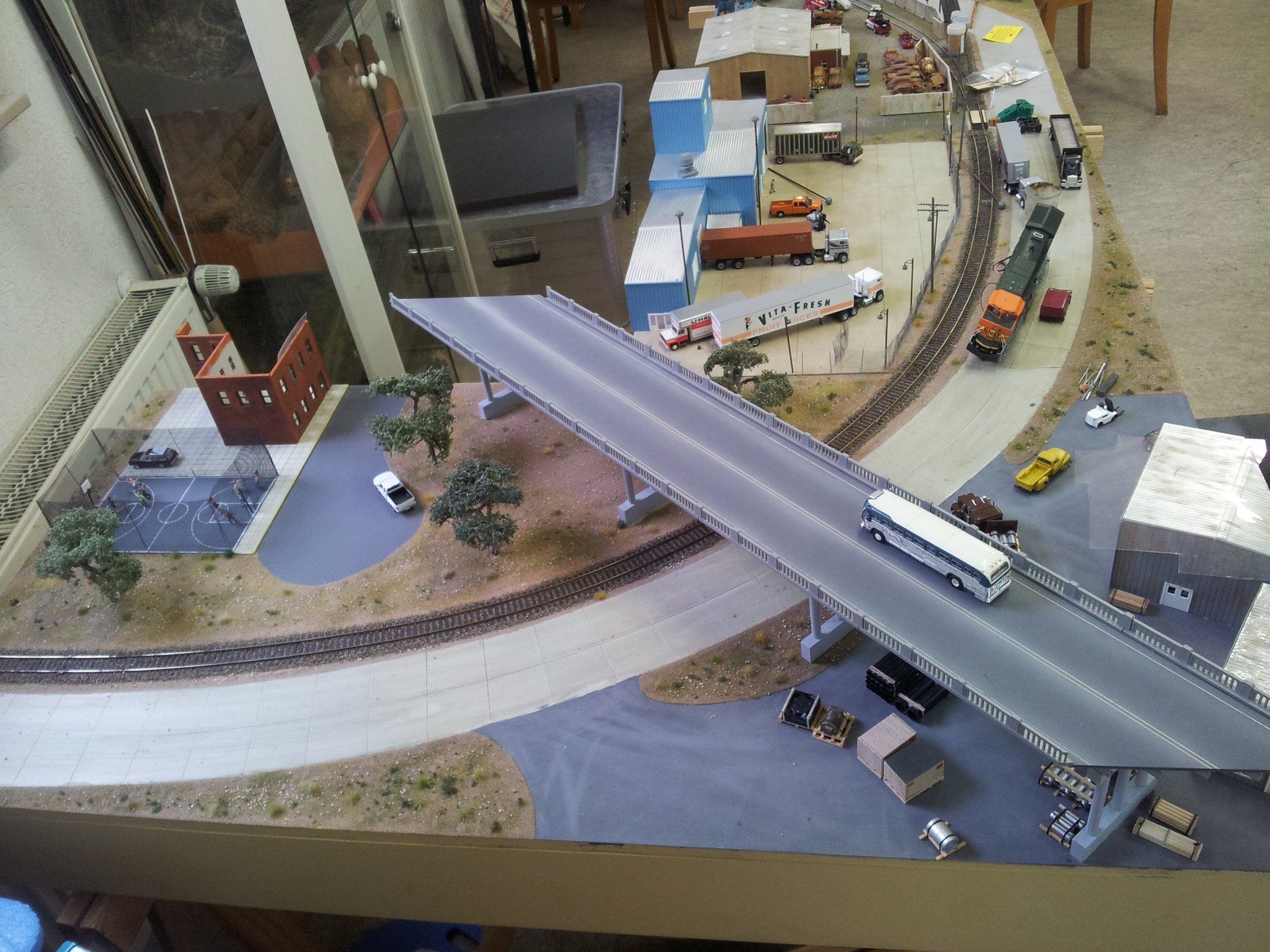 Die Straße von Rechts kommend mündet hier auf eine größere Querstraße, wodurch auf die andere Gleisseite gewechselt werden kann. Der Pool des Motels entstand aus einem Deckel einer großen Eispackung, da er eine passende ovale Form hat. Das Motel selbst ist ein Lasercut Bausatz aus den USA. Links sieht man das Empfangsgebäude für LKW-Waage und die Einfahrt in das Hafengebiet.