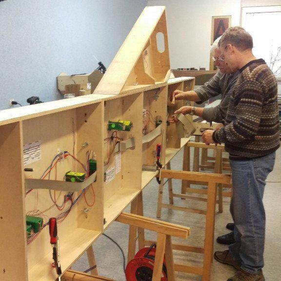 Es wurden alle 5 Kästen auf einmal gebaut. Über mehrere Basteltreffen wurden anschließend die Gleise gelegt. Nachdem der Gleisplan auf genügend Rangiermöglichkeiten geprüft wurde konnte alles verkabelt werden. Das Sägewerk bekam auf Grund seiner wenigen Weichen Outbusantriebe für die Weichen. Bei den 3 SGE Modulen hat Uwe ein eigenens Pult gebaut und alle Weichen werden hier elektrisch geschaltet. Die beiden Sägewerkmodule sind bei der Landschaftsgestaltung schnell voran gekommen, die SGE hat wegen der vielen angepassten Gebäude etwas länger gebraucht. Erste große Bewährungsprobe war beim US-Fahren 2016 im Bürgerhaus. Das Sägewerk wurde Ende 2016 fertig gestellt und konnte somit auf der Messe "Eurospoor" in den Niederlanden gezeigt werden. Ein knappes Jahr später war auch die SGE fertig und hatte ihre Premiere auf der 6. US Convention.