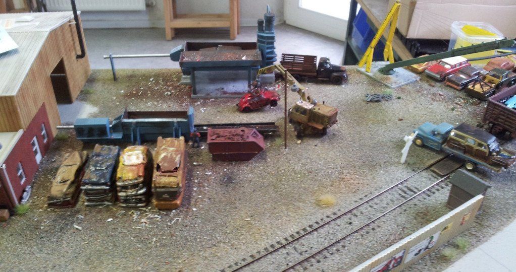 Auf dem letzten Modul enstand ein Schrottplatz, der den Straßenwechsel übers Gleis etwas realitischer wirken lässt. Auch hier gab es wieder genug passende Möglichkeiten viele Autos unterzubringen. Das zweite Gleis wird auf diesem Modul wieder auf die Main zusammengeführt. Am linken Modulrand zweigt ein weitere Gleis als Anschluss für den Schrottplatz ab. Unten ist die Zeichnung aller 5 Module zu sehen, Nummer 1 beginnend von rechts.