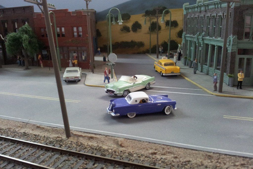 Die Modulgruppe "Blue Chevy Hills" erstreckt sich über 5 Module auf NAI 60cm Basis und wurde von Markus als Privatprojekt gebaut. Der Name "Blue Chevy Hills" entstand am Biertisch und passt sehr gut, da er sogar Markus's Leidenschaft für US-Autos enthält. Um möglichst realtistisch viele Autos auf einem Modul unterzubringen, kam Markus die Idee einer Kleinstadt mit verschiedenen Gebäuden am Stadtrand. Das Gleis weit vorne auf dem Modul ergibt auf der anderen Seite genug Platz für größere Gebäude. So beginnt das erste Modul mit einem erhöhten Autohaus sowie einer Tankstelle und Werkstatt sowie dem Schwenk der Straße auf die andere Gleisseite.