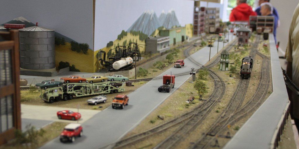 Der Wasserbereich beginnt auf den beiden linken Modulen und ist zum Teil nur klein angedeutet, damit genug Platz für Gleise bleibt. Die beiden Bahnübergänge in der Kurve waren eine echte Herrausforderung, aber am Ende laufen hier die Züge sauber drüber. Rechtzeitig zur 5. US-Conenvention 2015 ist "Port of Fairhaven" fertig geworden und konnte dort seine Premiere feiern. Mit Hintergrund und alle Module zusammen ergeben nochmal einen besseren Eindruck, und natürlich mit Autos und Wagen bestückt.