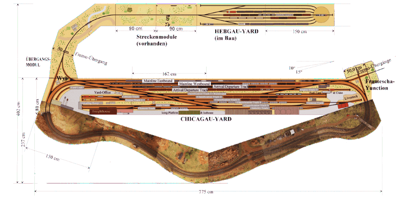 Über die Ausstellungen und im Vorfeld der US-Convention am 06. und 07.10.07 in Rodgau-Dudenhofen hat sich nun auch eine kleine US-Gruppe innerhalb des Vereins gebildet, die derzeit ein Bahnhofsvorfeld -ähnlich wie in Chicago- mit Industrieanschlüssen und Rangiermöglichkeiten baut. Gleichzeitig sollen dabei genormte Fremo-US-Abgänge installiert werden, so dass auch künftig ein Anschluss von Fremo-Modulen möglich ist. Hierzu wird dann auch die neuen H0-Fiddle-Yards herangezogen, was dann die betrieblichen Aspekte von der reinen Fahranlage zum sinnvollen Spielbetrieb ermöglicht. Die Zeichnung unten zeigt, dass Chicagau so geplant wurde, dass es den alten Fiddleyard von Horst Meiers "Sherman Hill" Anlage ersetzt. Dadurch entsteht ein Rundkurs mit vers. Abzweigen.